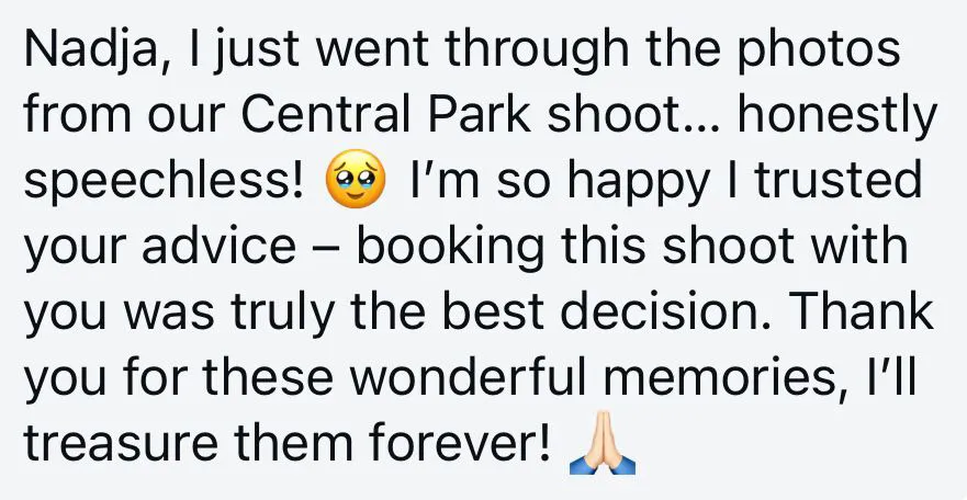 As early as possible, since my New York photoshoot dates tend to fill up quickly – especially during popular seasons like fall in Central Park or the Christmas holidays in Manhattan. I usually plan my NYC trips about six months in advance, so I recommend booking early as soon as you know your travel dates.