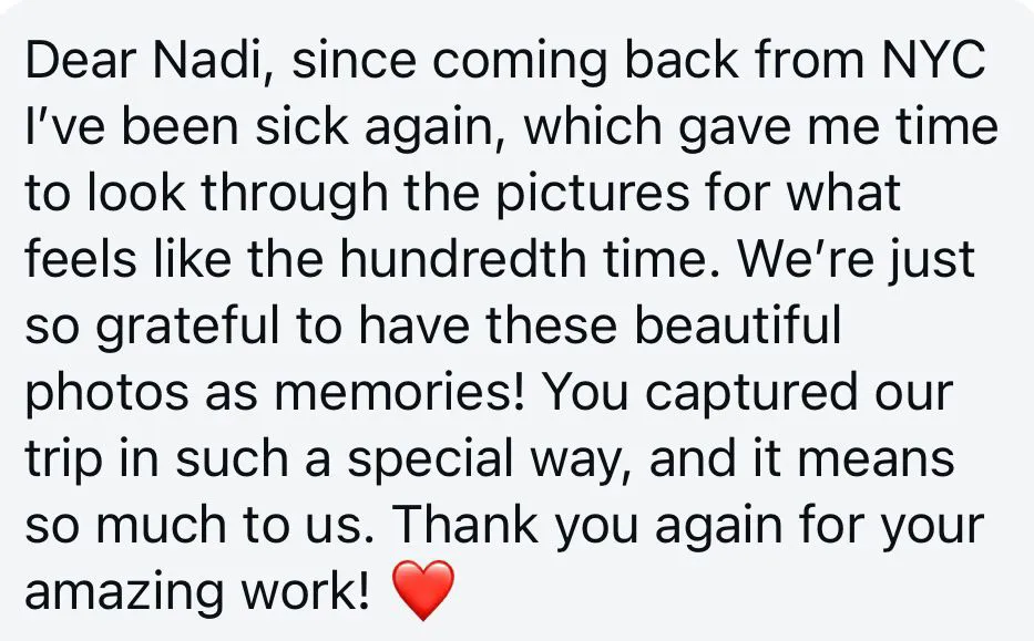 Absolutely! A photoshoot is not only for couples or families – you can also treat yourself to something special and create unforgettable memories. Many of my clients book a solo portrait session in NYC to capture their trip and take home unique images that tell their personal story.
