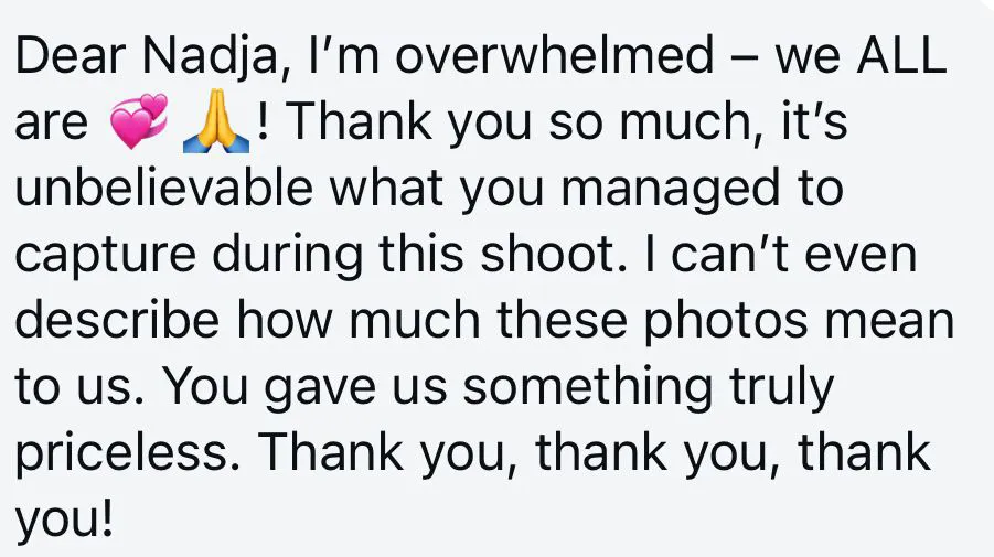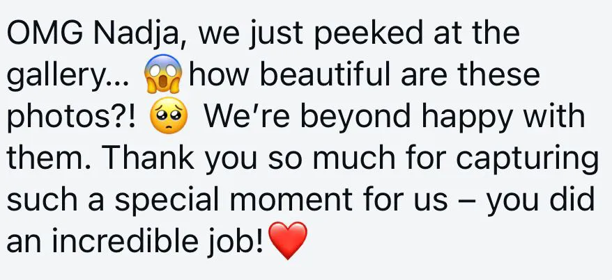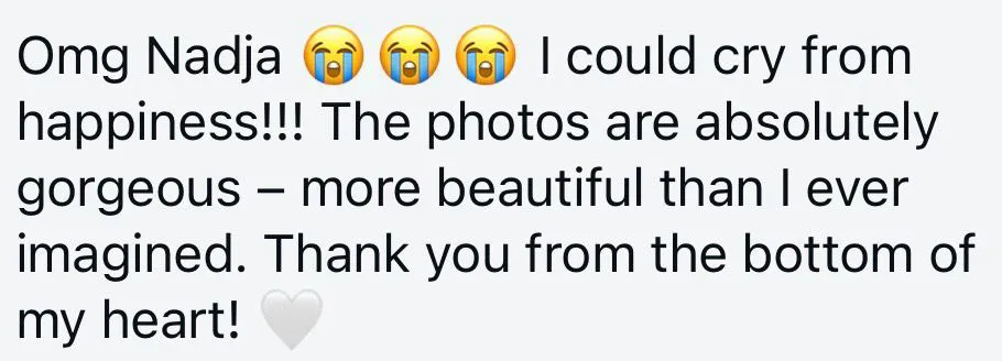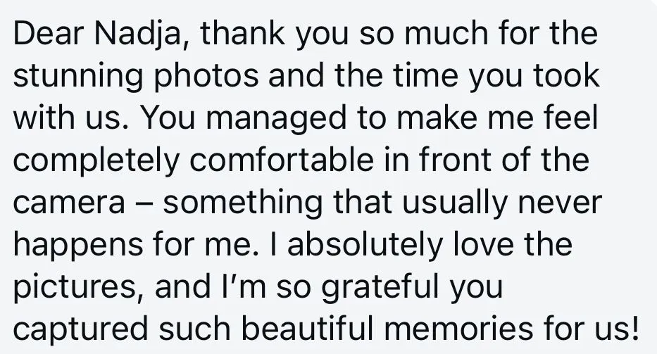 Shortly after your shoot, I’ll send you a small preview with 1–2 images so you can enjoy your first memories right away. The full, professionally edited gallery will usually be delivered within 2–3 weeks. This way, you’ll have a quick first glimpse and soon after a complete collection of high-quality photos to treasure.